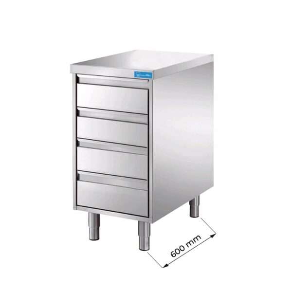 Cajoneras en acero inox con N.4 cajones y peto trasero L500xP600xH850 mm – linea premium