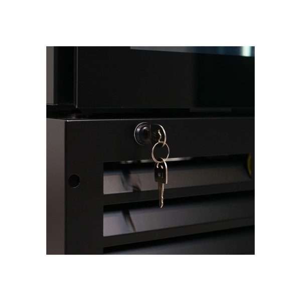 - Puerta batiente con manija integrada y cierre con llave;