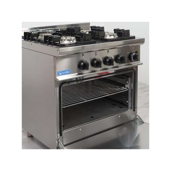 Cocina de gas 4 fuegos con 2 quemadores de 4,5 kw + 2 quemadores de 7,5 kw sobre horno de gas GN 2/1 potencia 7,9 kw