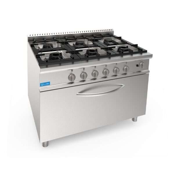 Cocina de gas 6 fuegos con 1 quemador de 3,5 kw + 2 quemadores de 5,5 kw + 3 quemadores de 7,4 kw sobre horno de gas GN maxi potencia 12 kw