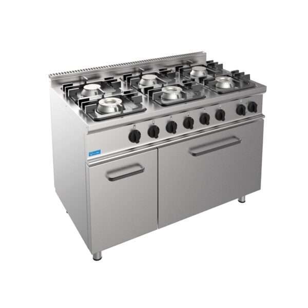 Cocina de gas 6 fuegos con 3 quemadores de 4,5 kw + 3 quemadores de 7,5 kw sobre horno de gas GN 2/1 potencia 7,9 kw