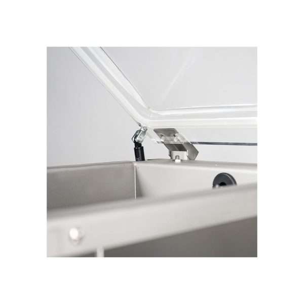 La tapa, hecha de policarbonato de 8 mm, está equipada con pistones automáticos para una apertura fácil.