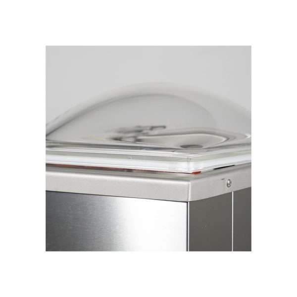 La tapa, hecha de policarbonato de 8 mm, está equipada con pistones automáticos para una apertura fácil.