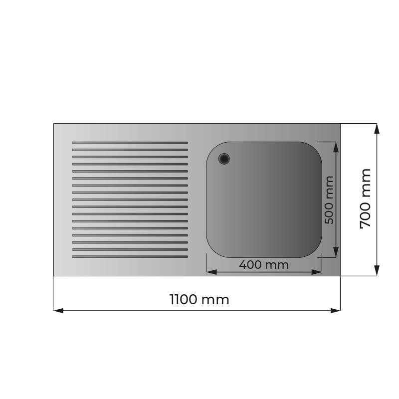 Fregadero abierto de acero inoxidable con 1 cuba y escurridor a la derecha L1100xP600xH850 mm – línea basic