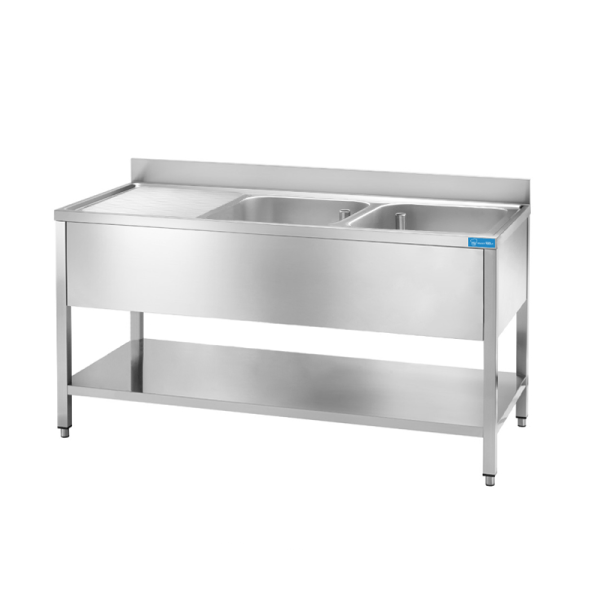Fregadero abierto de acero inoxidable con 2 cubas y escurridor a la izquierda L1500xP600xH850 mm – línea basic