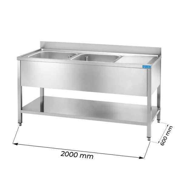 Fregadero abierto en acero inox sobre piernas con N.2 senos con peto trasero y gotero a la derecha L2000xP600xH850 mm – linea premium
