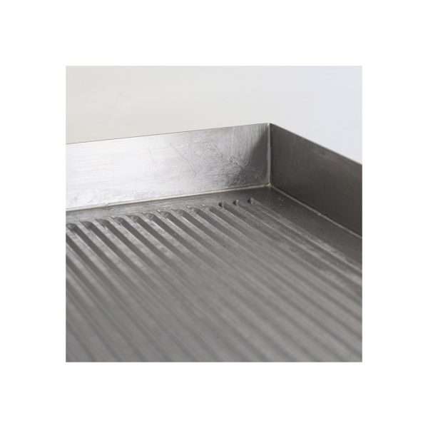 El Fry-Top tiene una robusta estructura de acero inoxidable y la placa rayada es de acero inoxidable.