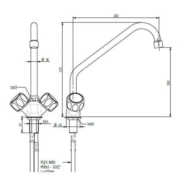 Grupo ducha de prelavado H 100 cm doble mando para fijar al fregadero
