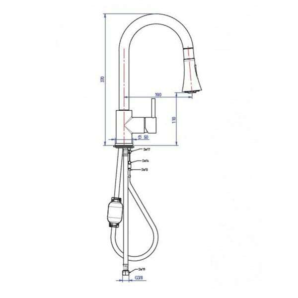 El grifo mono agujero H=37 cm con caño giratorio y ducha extraíble se presenta con una línea elegante y refinada.