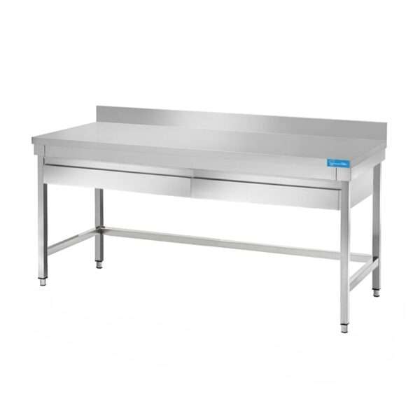 Mesa de acero inoxidable con 2 cajones sin estante de fondo con peto trasero L1000xP600xH850 mm