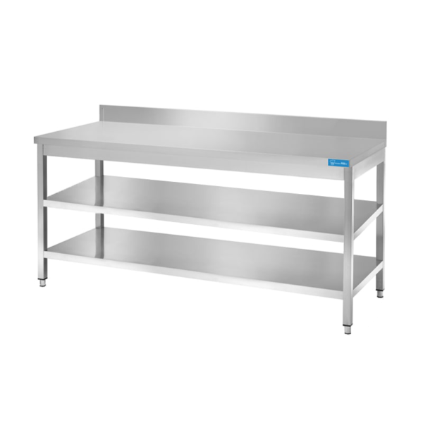 Mesa de acero inoxidable con 2 estantes con peto trasero – L400xP600xH850 mm