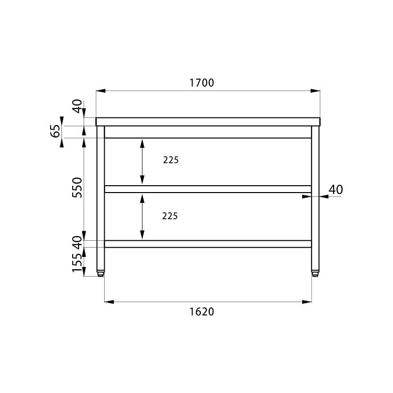 Mesa de acero inoxidable con 2 estantes sin peto trasero – L1700xP700xH850 mm