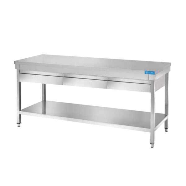 Mesa de acero inoxidable con 3 cajones con estante de fondo sin peto trasero L1500xP700xH850 mm