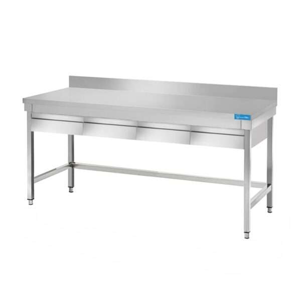 Mesa de acero inoxidable con 4 cajones sin estante de fondo con peto trasero L1800xP700xH850 mm