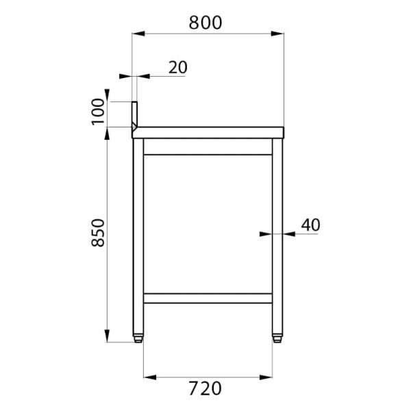 Mesa abierta de acero inoxidable con estante de fondo con peto trasero L800xP600xH850 mm – línea basic