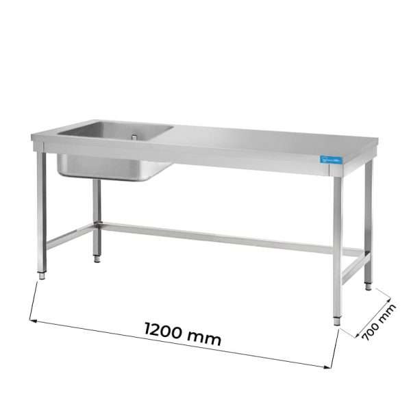 Mesa abierta de acero inoxidable con lavabo a la izquierda sin estante sin peto trasero L1200xP700xH850 mm – línea basic