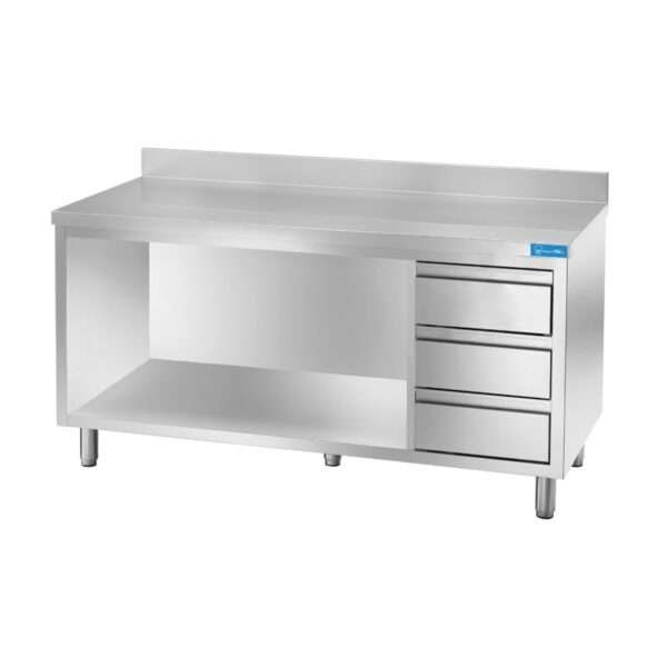 Mesa de acero inoxidable abierta con 3 cajones verticales a la derecha con peto trasero L2200xP600xH850 mm – línea basic