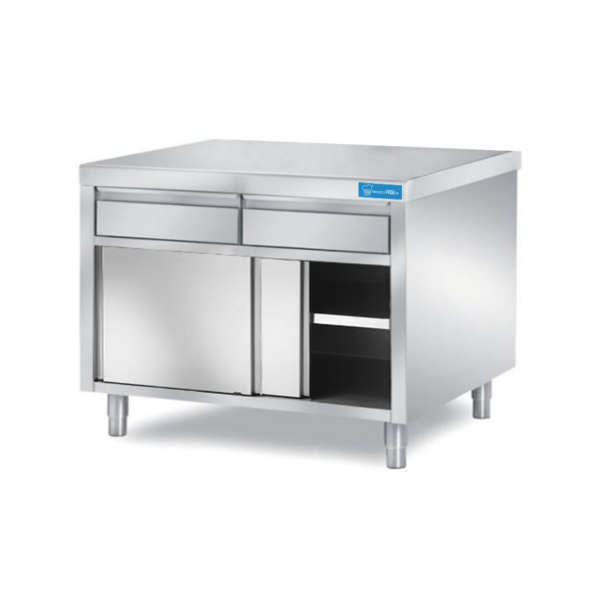 Mesa con puertas de acero inoxidable con 2 cajones horizontales sin peto trasero – L1200xP600xH850 mm