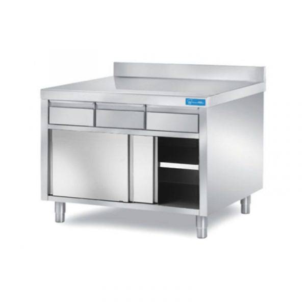Mesa de acero inoxidable con puertas con 3 cajones horizontales con peto trasero L1600xP700xH850 mm – línea basic