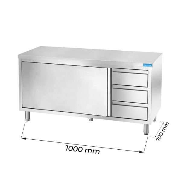 Mesa de acero inoxidable con puertas y cajones verticales a la derecha sin peto trasero – L1000xP700xH850 mm