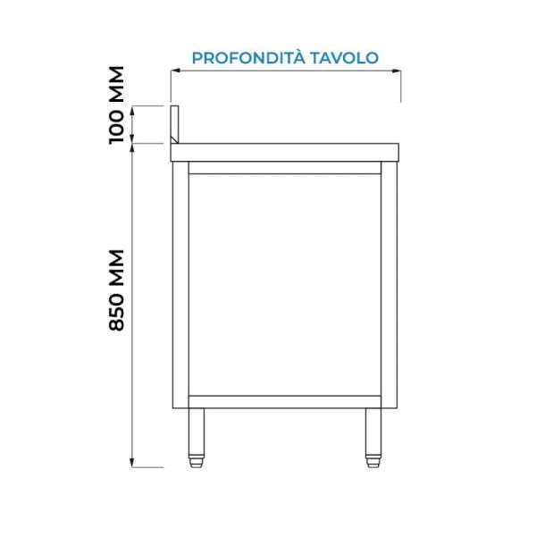 Mesa de acero inoxidable con puertas con peto trasero L1800xP600xH850 mm – línea basic