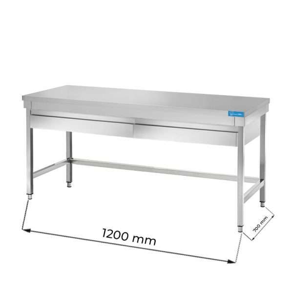 Mesa en acero inox con N.2 cajones sin estante inferior L1200xP700xH850 mm – linea premium