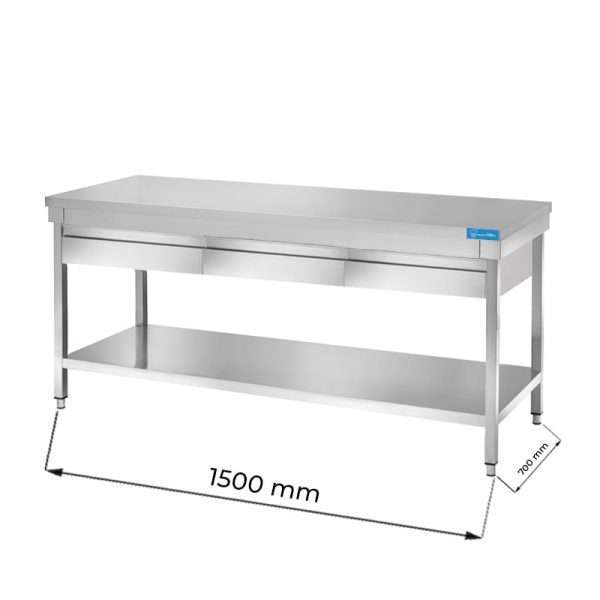 Mesa en acero inox con N.3 cajones con estante inferior L1500xP700xH850 mm – linea premium