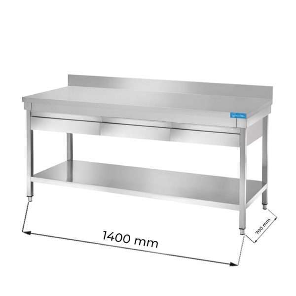 Mesa en acero inox con N.3 cajones con estante inferior y con peto trasero L1400xP700xH850 mm – linea premium