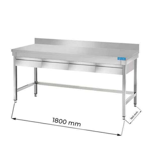 Mesa en acero inox con N.4 cajones sin estante inferior y con peto trasero L1800xP700xH850 mm – linea premium