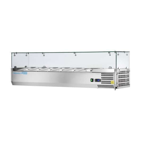 La vitrina para ingredientes colocada encima del mostrador pizzería tiene una estructura de acero inoxidable.