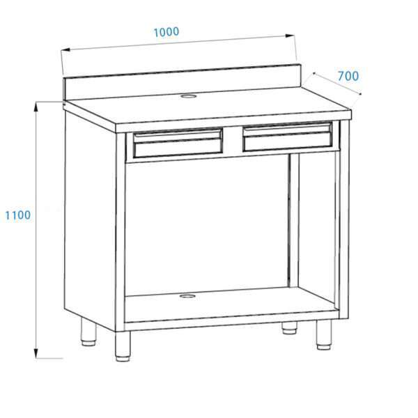 Mueble para máquina café de acero inoxidable con top con peto trasero con cajón batiente de filtro y cajón de servicio L1000xP700xH1100 mm