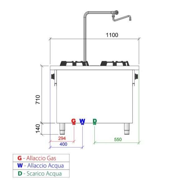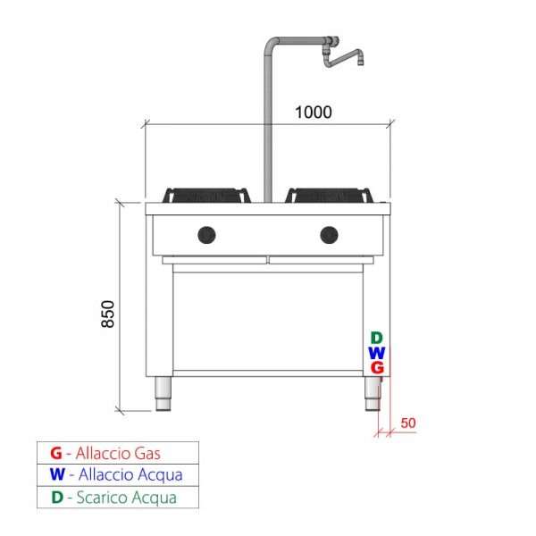 Placa de gas para wok bifronte sobre mueble con n° 4 quemadores y columna de agua – longitud 1000 mm