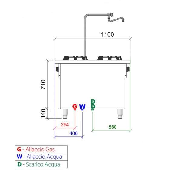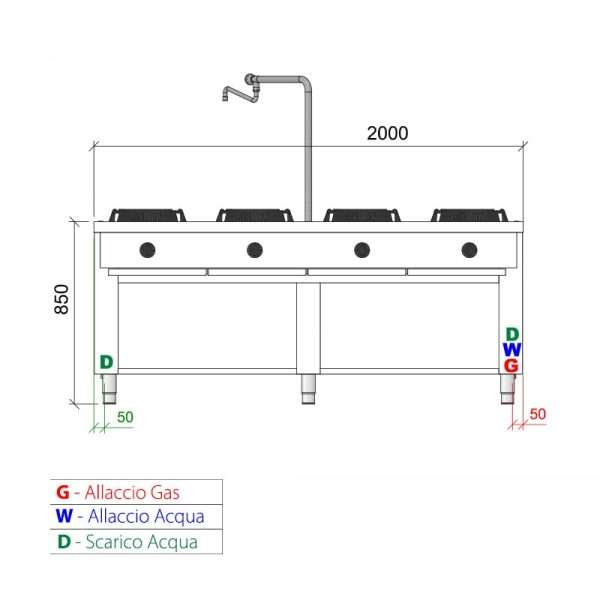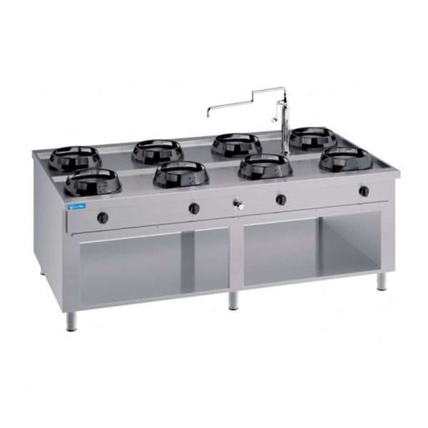 Placa de gas para wok bifronte sobre mueble con n° 8 quemadores y columna de agua – longitud 2000 mm