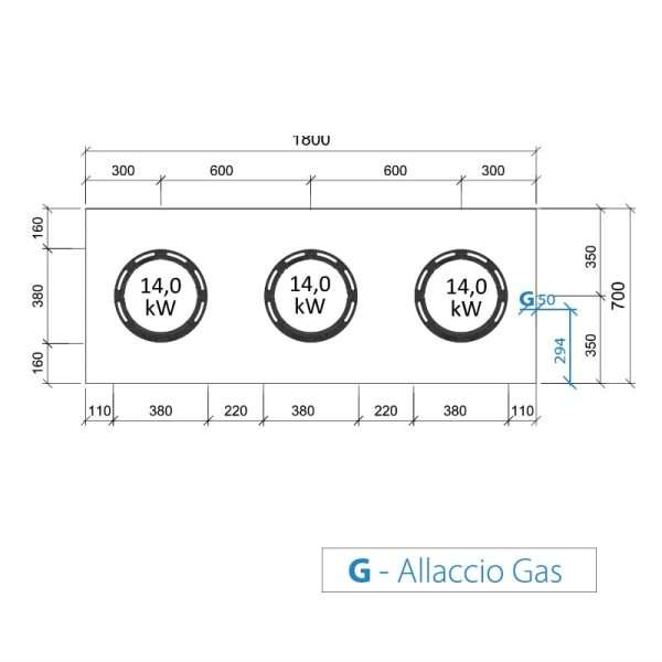 Placa de gas para wok sobre mueble con n° 3 quemadores de 14 kw cada uno – longitud 1800 mm