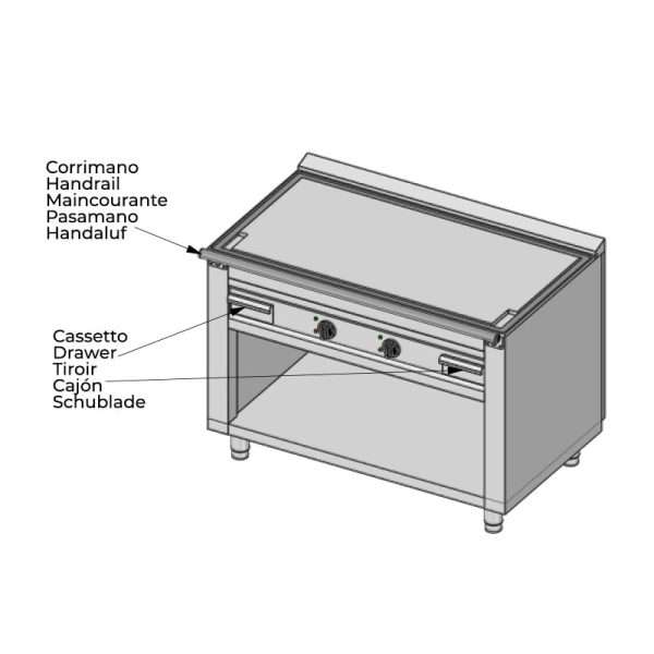 La base de la placa teppanyaki está cerrada por tres lados y tiene un estante inferior con pies ajustables en altura. Además, está equipada con un pasamano tubular de acero inoxidable.