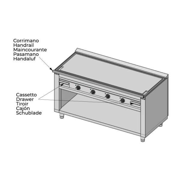 La base de la placa teppanyaki está cerrada por tres lados y tiene un estante inferior con pies ajustables en altura. Además, está equipada con un pasamano tubular de acero inoxidable.