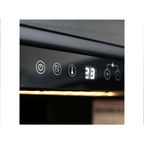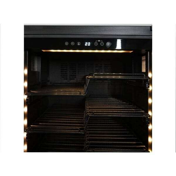 La vinoteca tiene una estructura de chapa negra, mientras que la interior es de ABS negro y tiene luz interior led.