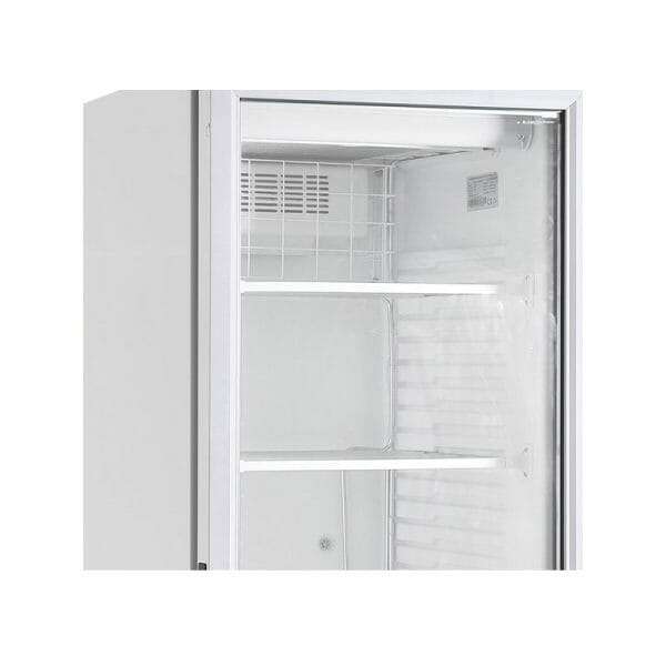 Vitrina expositiva estática blanca con agitador con puerta de vidrio y 5 estantes temperatura de -18°C a -24°C – capacidad 360 lt