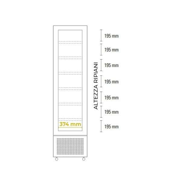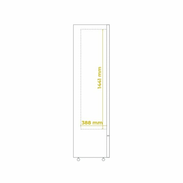 En el interior, la vitrina cuenta con 7 estantes fijos para poder presentar mejor los productos, también está equipado con 2 tiras de led verticales.