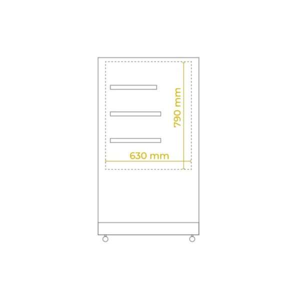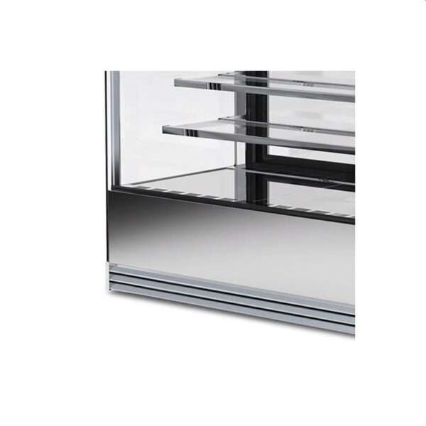 La vitrina consta de una estructura de acero inoxidable, plástico y vidrio templado.