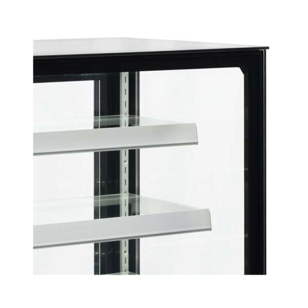 La vitrina consta de una estructura de acero inoxidable pintado negro, plástico y vidrio templado.