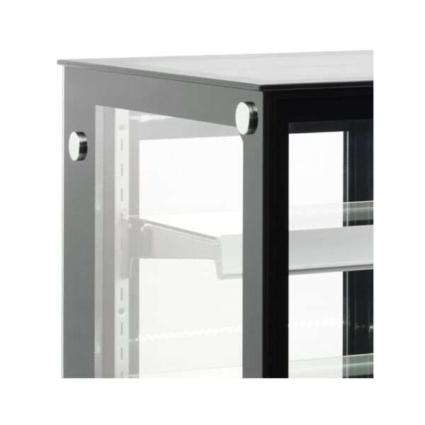 La vitrina consta de una estructura de acero inoxidable, plástico y vidrio templado.
